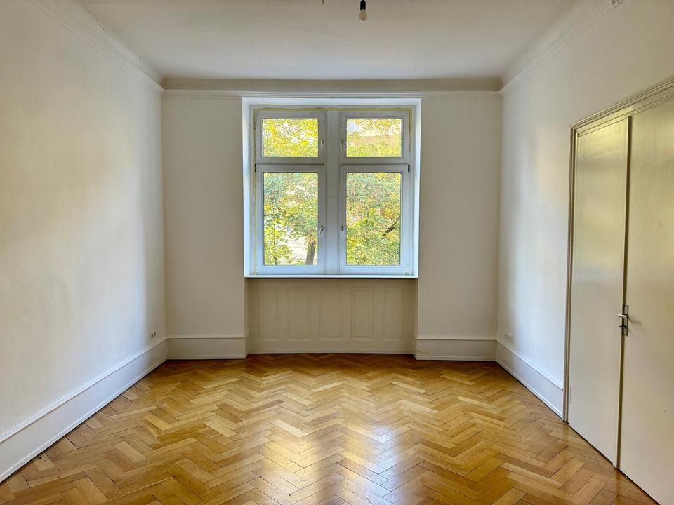 In einem repräsentativen Altbau der Jahrhundertwende erwartet Sie eine lichtdurchflutete Etagenwohnung im 1. Obergeschoss mit ca. 140 m² Wohnfläche. Der Grundriss bietet vier Zimmer, eine Küche, ein großes Tageslichtbad sowie ein separates Gäste-WC. Zwei Balkone – ein kleiner zur Straße und ein grö&szl ...