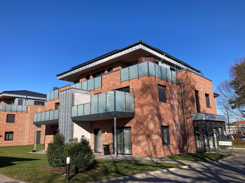 Die moderne Wohnung befindet sich im 1. Obergeschoss eines gepflegten Mehrfamilienhauses (Baujahr 2020) mit nur drei Etagen. Im Erdgeschoss ist eine Volksbank-Filiale untergebracht. Ein Fahrradschuppen steht zur gemeinschaftlichen Nutzung bereit. Die Wohnung ist barrierearm und über einen Personenaufzug erreichbar.