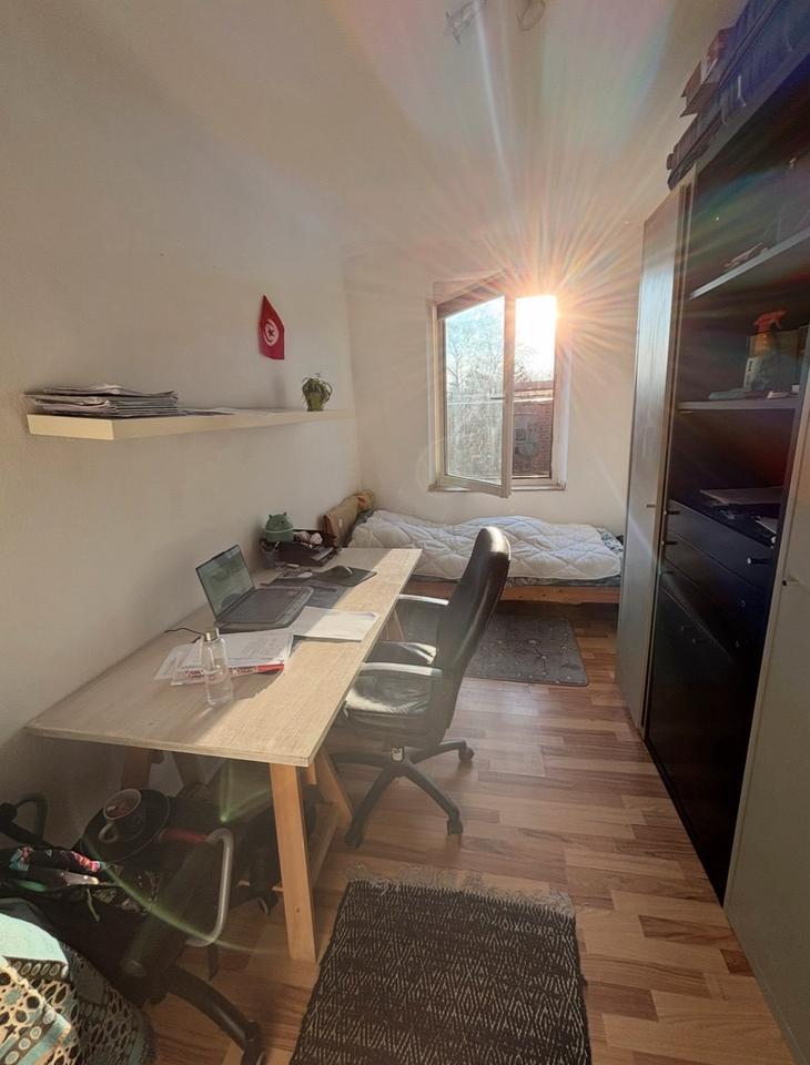 möbliertes sonniges Zimmer (11 m²) in einer 4er-WG in ruhiger Lage in Aachen-Kohlscheid. Das Zimmer ist gut geschnitten und vollständig ausgestattet, ideal für Studierende: großes Bett, großer Kleiderschrank, großer Schreibtisch und weitere Möbel – ein direkter Einzug ist problemlos möglich.